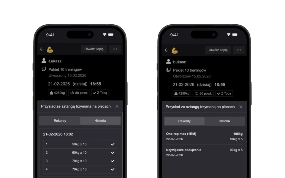 - Historia i rekordy: Twój klient może w każdej chwili wrócić do poprzednich treningów, analizować wyniki i śledzić swoje rekordy (np. w wyciskaniu na ławce). Widok rosnących ciężarów i poprawiających się wyników to najsilniejszy motywator.